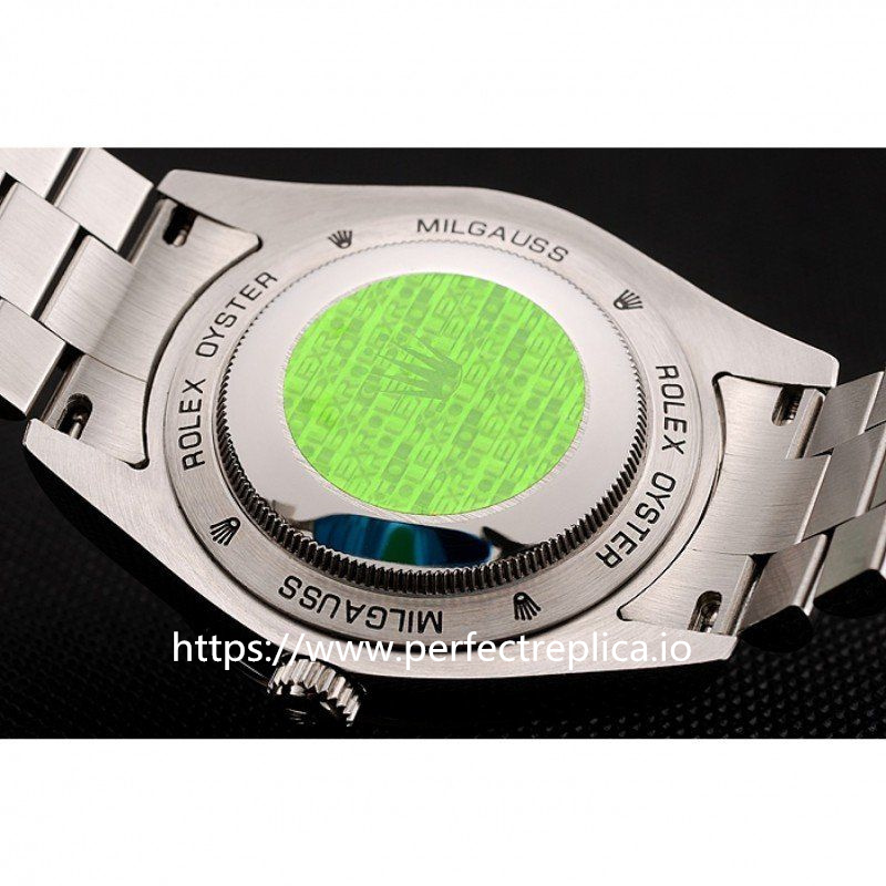 • Back: Rolex Oyster Milgauss engraved polished stainless steel snap-in back with Rolex green authenticity sticker