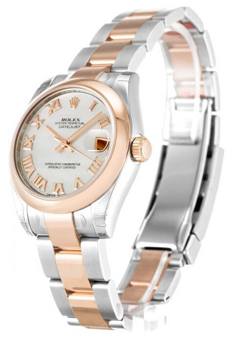 The rose gold bezel reflects the luxury of the watch. Gentle and natural colors add to the beauty of this watch. The combination of silver and rose gold makes the watch look not monotonous. The 31mm case is very small. Therefore, this fake Rolex watch is more suitable for girls. The curve of the entire replica watch is perfect. The crown on the side of the watch is polished to make it more beautiful and bright. However, the crown is small. Therefore, it is easily overlooked by people.