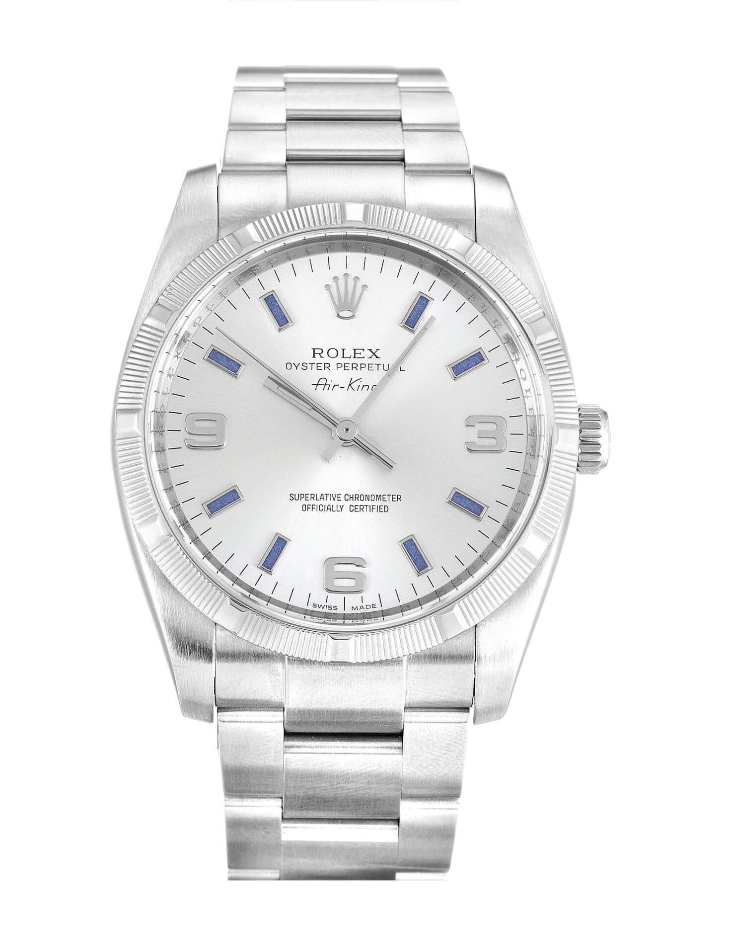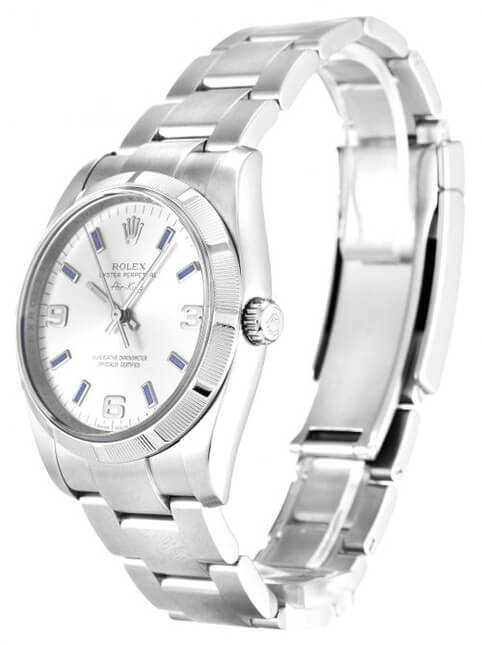 The threaded bezel and polished lugs provide texture to this perfect cloned watch. Although it is made of stainless steel, the watch replica after processing is simple and beautiful. The silver monochromatic watch is a symbol of purity. It is full of mysterious charm with blue hour markers. Although the fake Rolex Air-King watch is only 34 mm, it can be worn on any occasion. Moreover, the 34mm size watch is unisex. Its practical performance is stronger.